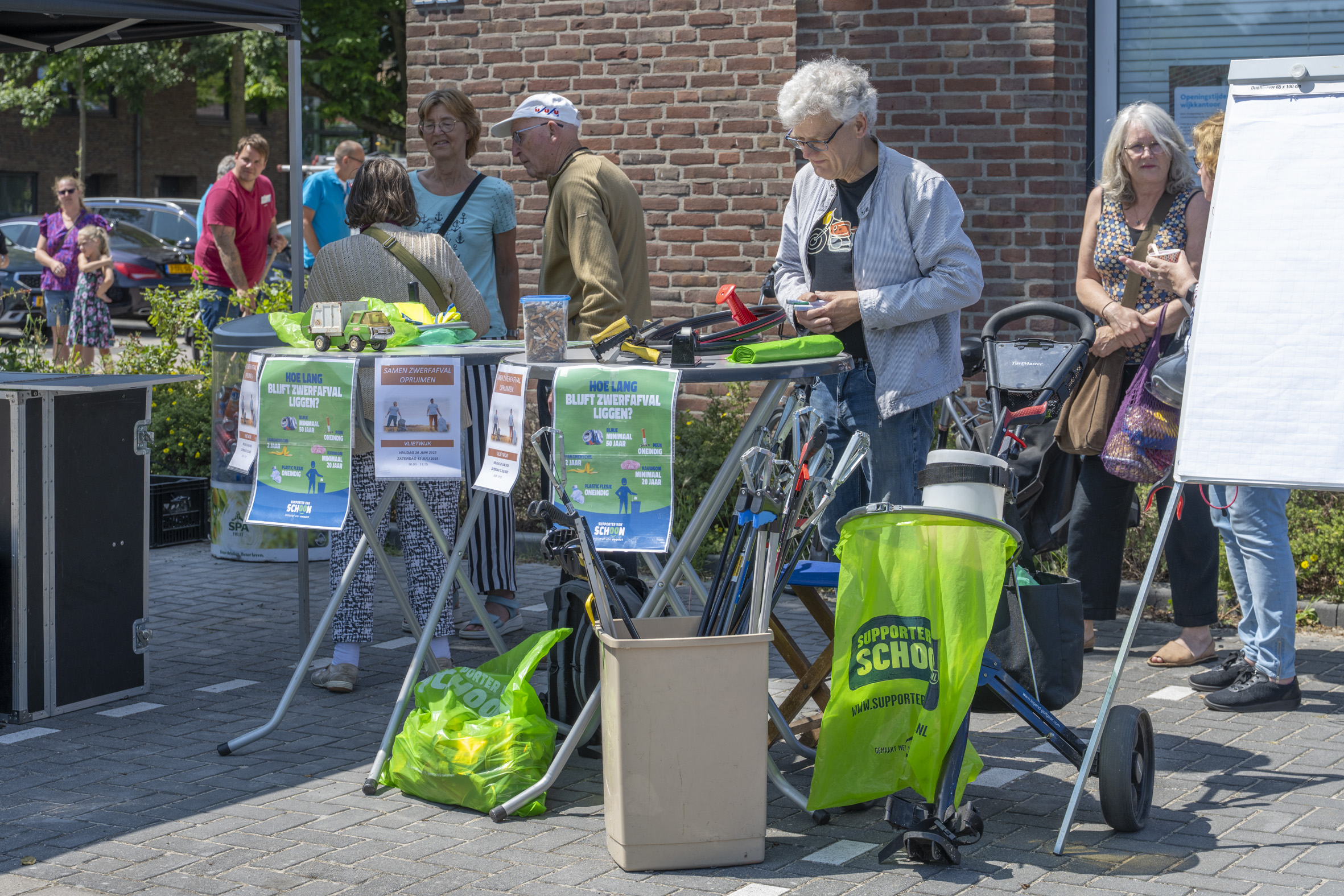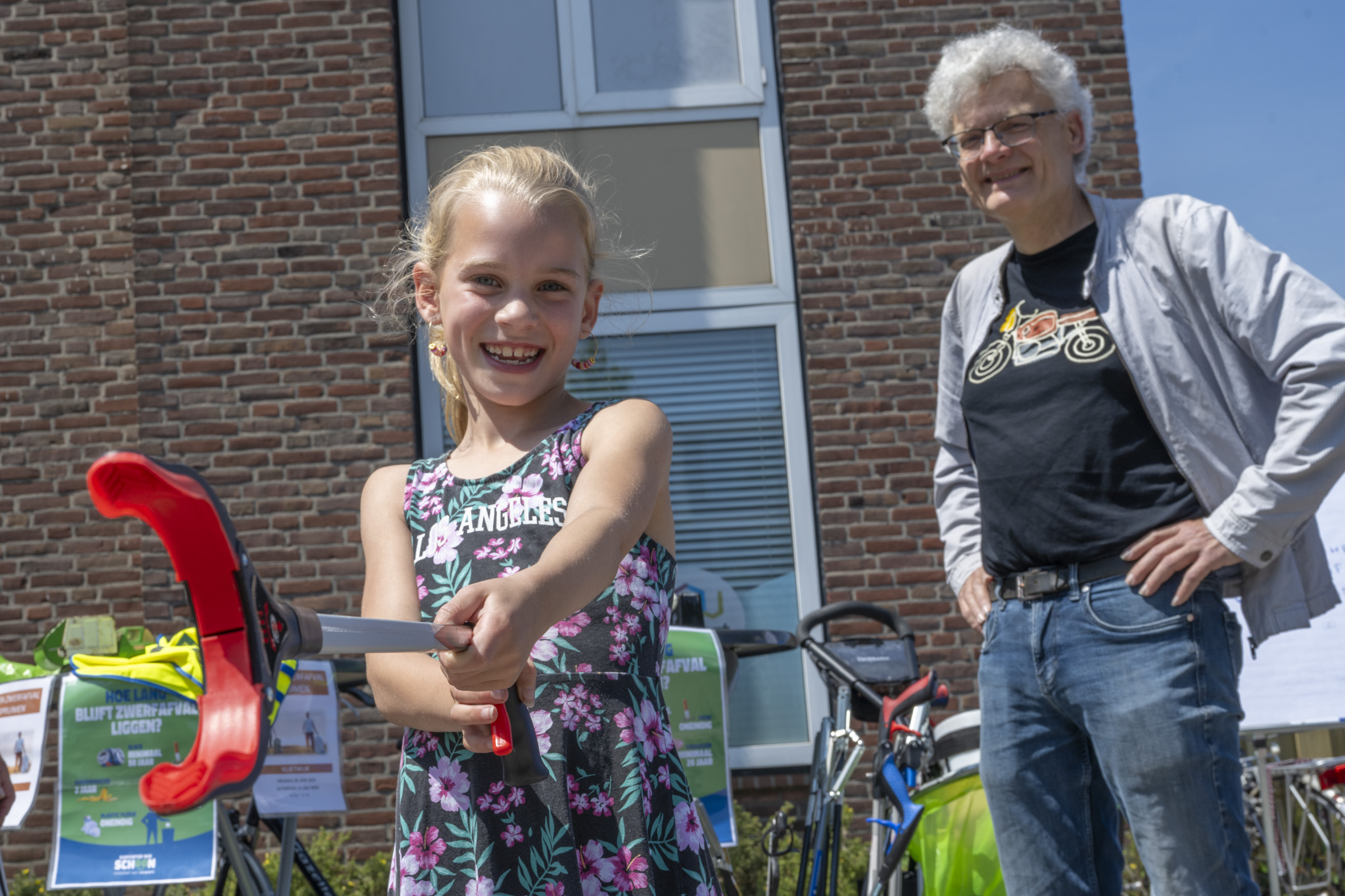 De jutters van Voorschoten Schoon waren er ook met een kraam om bewoners te informeren over acties om zwerfafval op te ruimen. Natuurlijk werden de grijpstokken meteen gebruikt om met de buurtkinderen afval te verzamelen.